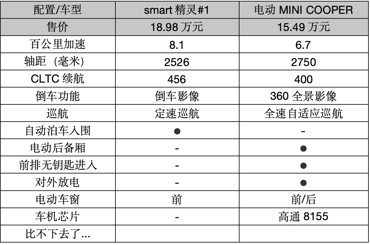 即使如此,銷(xiāo)量依然不盡人意,相關(guān)數(shù)據(jù)顯示,其今年1-5月份上險(xiǎn)量9099輛,同比下滑53.6%,況且smart精靈#1的配置還比電動(dòng)MINI COOPER優(yōu)秀那么多!