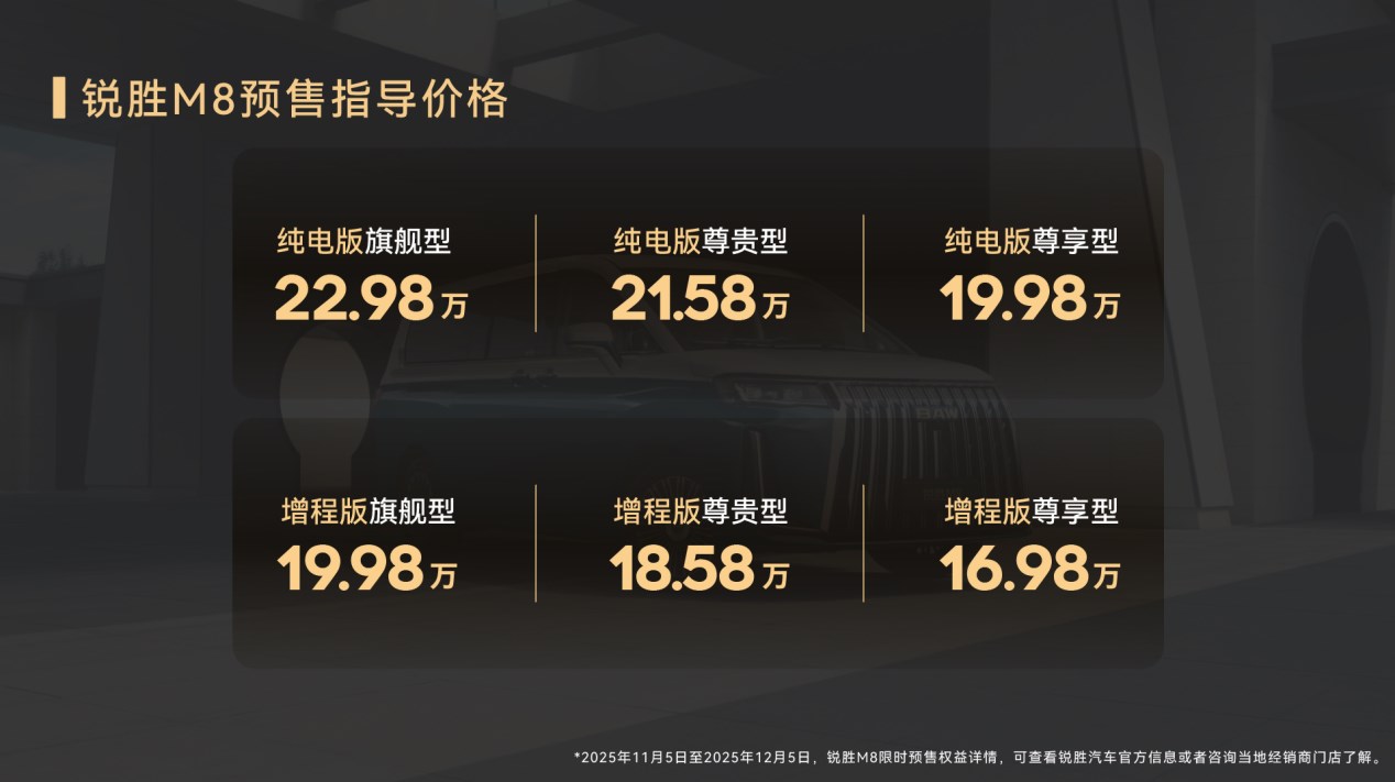 11月5日,作為北京汽車制造廠旗下專注MPV賽道的獨(dú)立品牌,銳勝汽車在青島召開“全場景·才是真舒享”銳勝M(fèi)8預(yù)售發(fā)布會(huì)。銳勝M(fèi)8提供多種動(dòng)力版本,預(yù)售價(jià)格分別為:銳勝M(fèi)8-增程版169800元起,銳勝M(fèi)8-EV版199800元起。全系車型擁有多場景適用與經(jīng)濟(jì)實(shí)用性,兼顧越級空間及豐富配置,盡享三排都是商務(wù)艙的奢適感,給出了大型MPV高質(zhì)價(jià)比的新選擇。