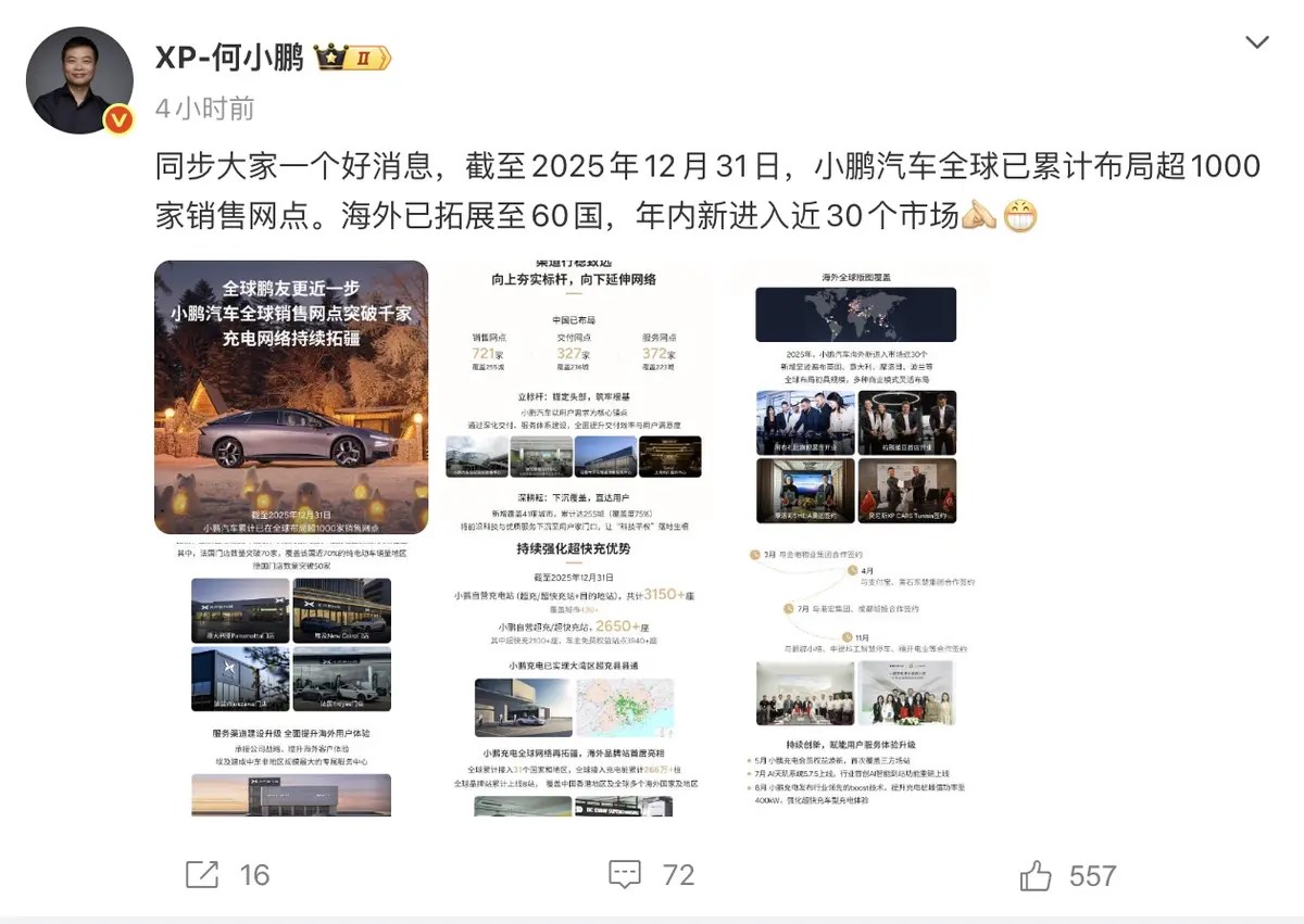 1月20日,小鵬汽車董事長何小鵬在社交媒體上宣布,截至2025年12月31日,小鵬汽車全球已累計(jì)布局超1000家銷售網(wǎng)點(diǎn),海外已拓展至60國,年內(nèi)新進(jìn)入近30個(gè)市場。